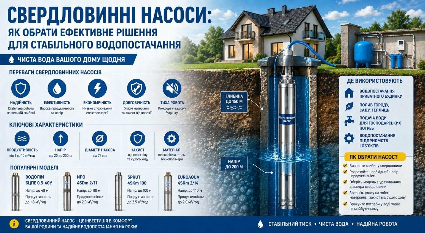 Свердловинні насоси — це найефективніше рішення для глибоких джерел води. Вони забезпечують стабільний тиск, високу продуктивність і довговічність системи.