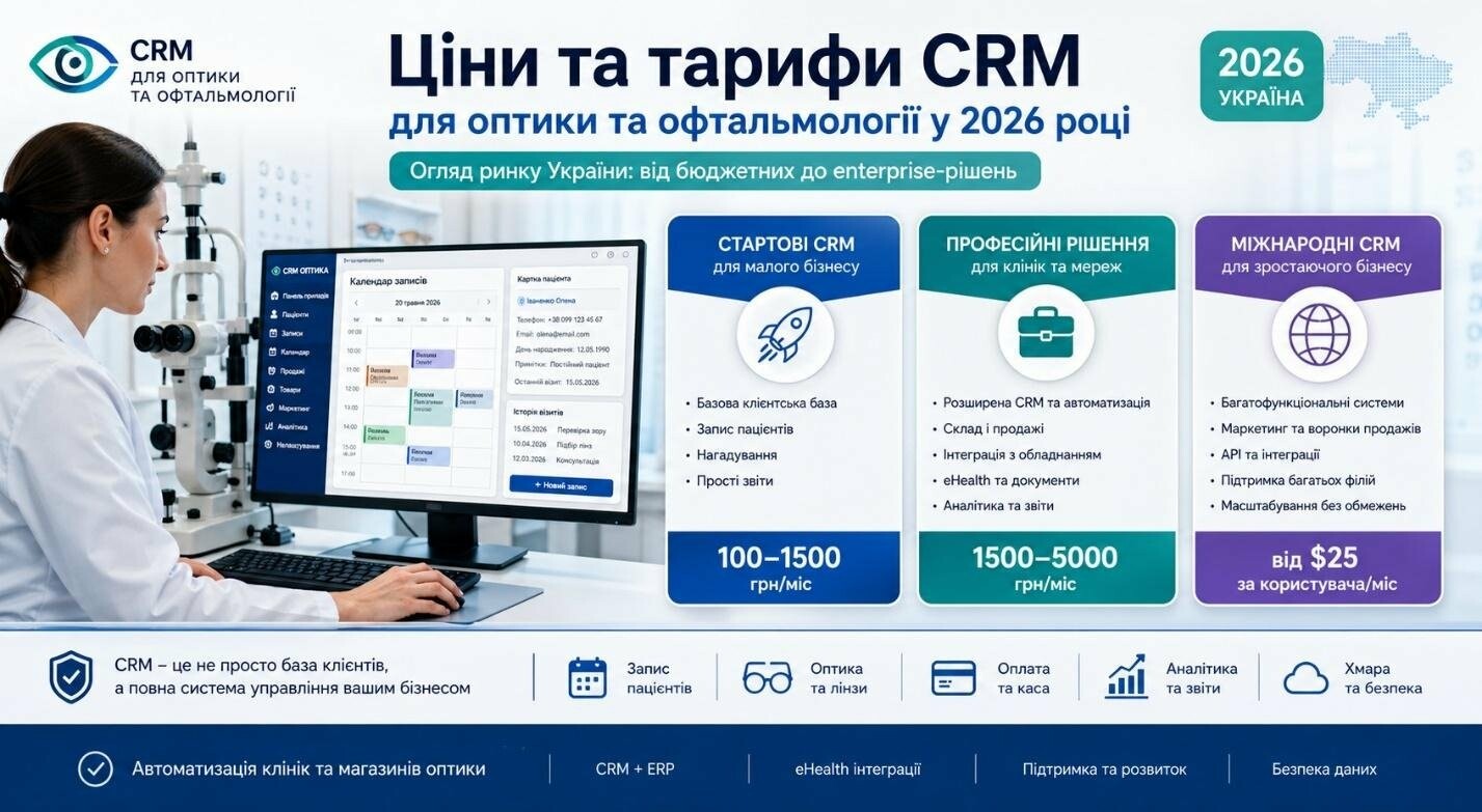 Ціни CRM для оптики та офтальмології в Україні у 2026 році формуються не просто як вартість програмного забезпечення, а як інвестиція у керованість бізнесу. Власники клінік і оптик дедалі частіше стикаються з питанням: скільки насправді коштує автоматизація і що входить у тариф.